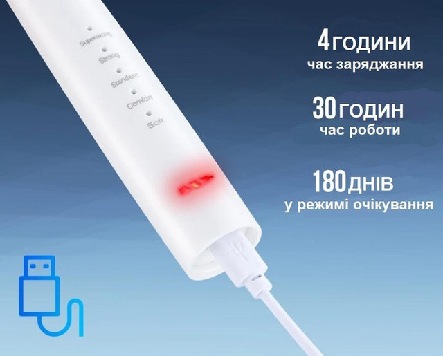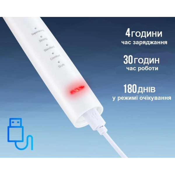 Медична сталь забезпечує безпечне та довговічне використання, а USB-зарядка дає змогу використовувати прилад автономно вдома або в поїздках. Дзеркало для огляду порожнини рота полегшує контроль за процесом чищення та підвищує ефективність гігієни.