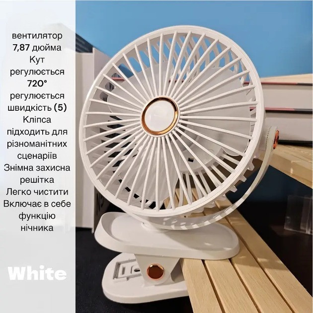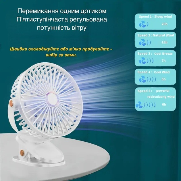 Акумуляторний вентилятор VHG F03 — це компактний і потужний помічник для роботи, сну або відпочинку. Пристрій поєднує тиху роботу, зручність перенесення та функціональність: його можна використовувати як настільний, так і підвісний вентилятор із затискачем. Додаткова LED-підсвітка виконує роль нічника з регулюванням яскравості в 3 рівні.