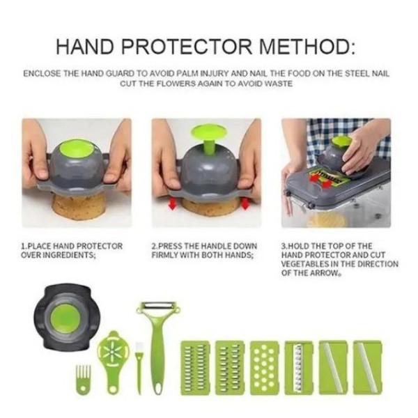 22 насадки забезпечують максимально різноманітні варіанти нарізання: скибочки, кубики, соломку, шатківницю, тертку, а також овочечистку, друшляк і ситечко. Безпечна конструкція із захисною насадкою запобігає травмам, а ножі з неіржавкої сталі гарантують довговічність і гострий різ.