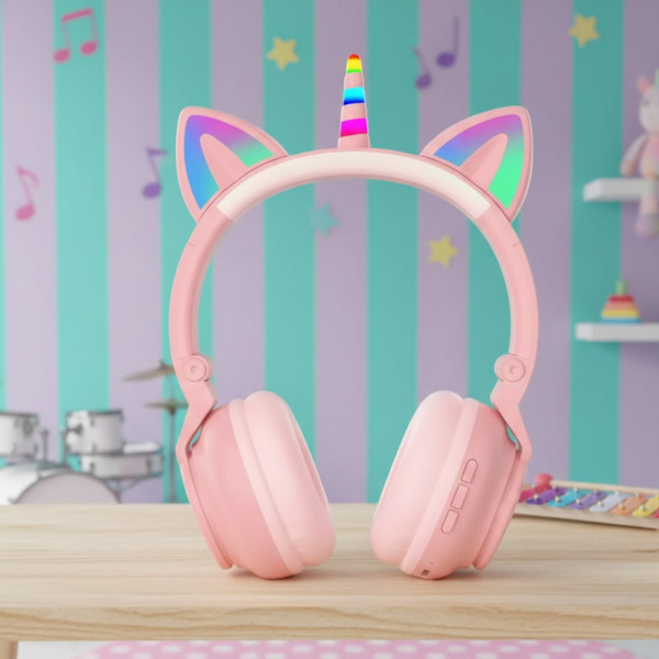 Bluetooth навушники Єдиноріг із котячими вушками відрізняються від більшості інших моделей аудіогарнітури, що світяться маленькими котячими вушками та ріжком єдинорога. Цей дизайн має особливу популярність серед молодого покоління, завдяки тому, що є підсвітка вушок і ріжка.