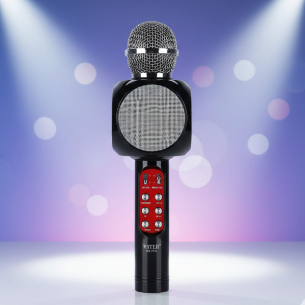 Мікрофон із динаміком зовні являє собою стандартний вокальний мікрофон із кубічним модулем, вбудованим у колодку. У цей модуль вбудовані 2 стереодинаміки, а також панель керування функціями та звуком. Кнопка увімкнення та повзункові регулятори звуку зручно розташовані під великим пальцем. Завдяки їм ви легко та швидко зможете налаштувати відповідний вам рівень гучності голосу (Volume), підрегулювати високі частоти (Treble), нижні частоти (Bass), додати ефект відлуння (Echo), підібрати гучність відтворюваним пристроєм музики (Music).