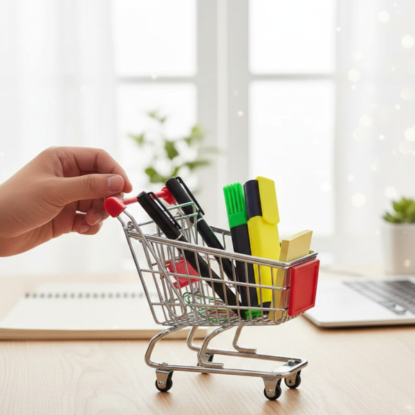 Мніатюрний візок із супермаркету зручний як підставка під дрібні канцелярські предмети.