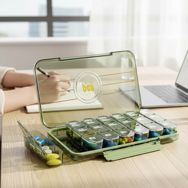 Корпус виготовлений із міцного та безпечного пластику, який не взаємодіє з ліками, що гарантує тривале використання та збереження препаратів. Компактні розміри органайзера дають змогу легко брати його із собою в сумку або зберігати вдома, не займаючи багато місця. Контейнер-диспенсер допомагає підтримувати точність і дисципліну в прийманні медикаментів, знижуючи ризик помилок.