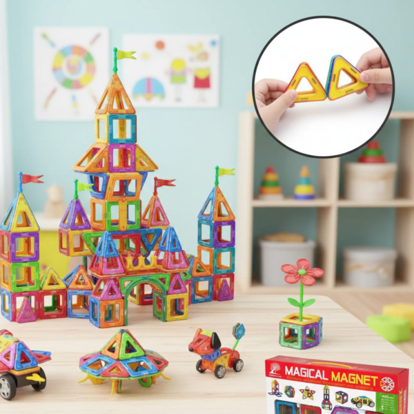 Магнітний конструктор Magical Magnet 3D з 98 деталей — це іграшка, яка відкриває дітям світ творчості, уяви та інженерного мислення. Деталі конструктора забезпечені вбудованими магнітами, що дає змогу легко з'єднувати елементи між собою, створюючи різні фігури, моделі машин, тварин, веж та інших конструкцій.
