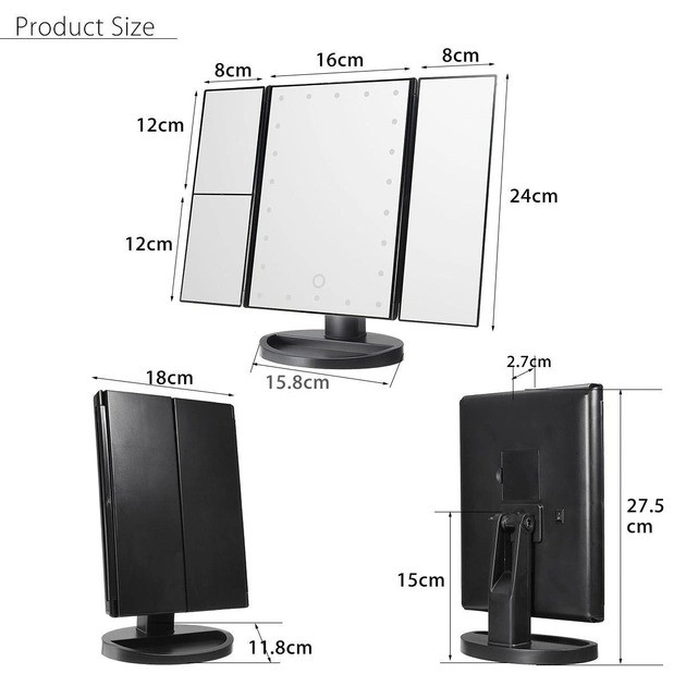 Освітлення працює завдяки звичайним батарейкам (ААА) або USB-приєднання. Завдяки своїй автономності дзеркало стане ідеальним помічником не тільки вдома, але й поза ним, на дачі, на природі.