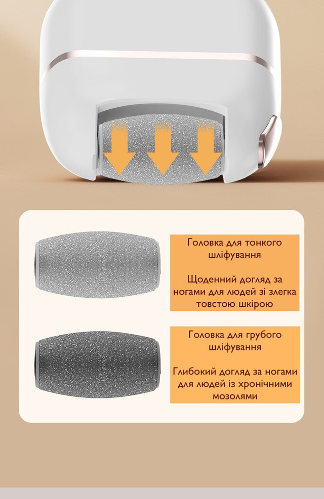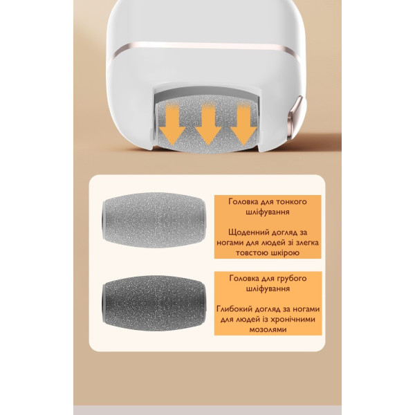 Змінні ролики: 2 насадки різної зернистості для м'якої та грубої обробки.