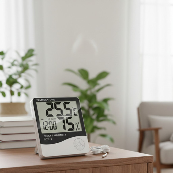 Мультифункціональний електронний цифровий термометр із виносним датчиком температури та годинником НТС-2 має 2 термометри для вимірювання температури всередині приміщення та виносний датчик температури для вулиці, гігрометр, годинник і будильник, які поєднані в одному невеликому за розмірами корпусі. Ви можете поставити на його полицю, підвіконня або повісити на стіну. Інформація про температуру та вологість, а також поточний час зображаються на великому дисплеї, тож зчитувати її легко та зручно. Є так само функція відстеження максимального та мінімального значень температури повітря та вологості.