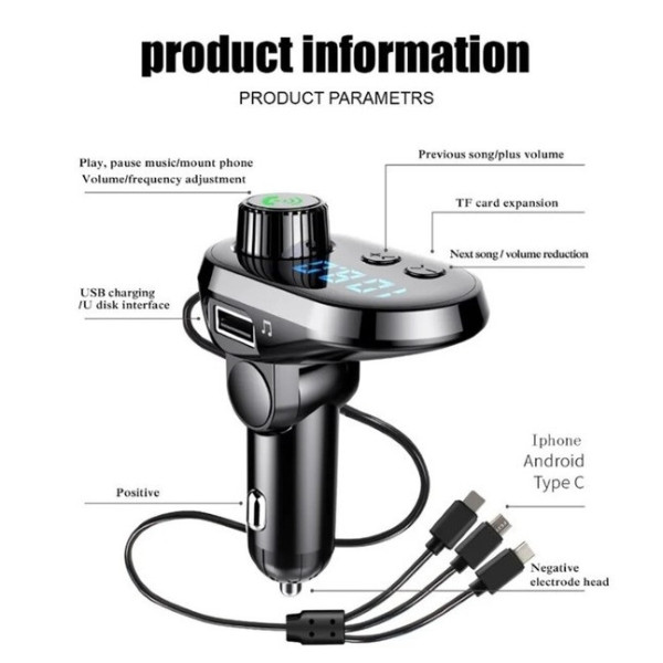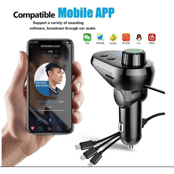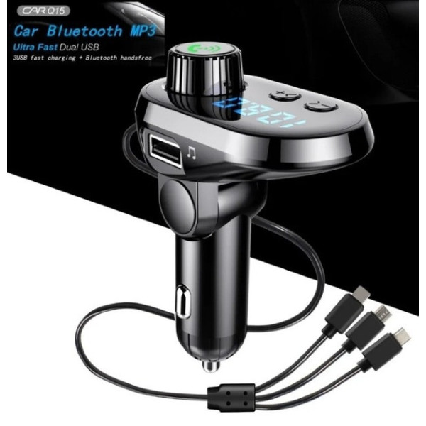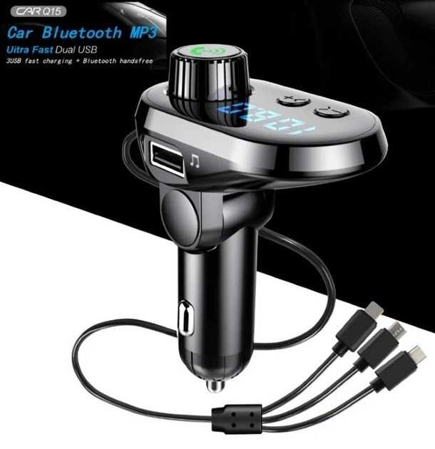 Автомобільний FM-модулятор Q15-BT — сучасний пристрій для відтворення музики та заряджання ґаджетів у дорозі. Завдяки вбудованим кабелям із роз'ємами Type-C, Micro USB и Lightning, він підходить для будь-яких смартфонів і планшетів, забезпечуючи швидке заряджання та зручність під'єднання.