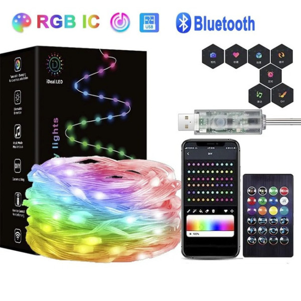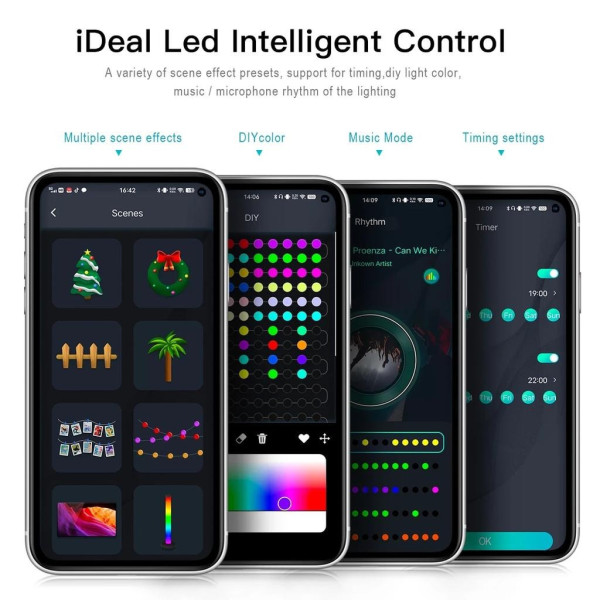 Кожен світлодіод WS2812B RGBIC має незалежне керування, що дає змогу програмувати комбінації, ефекти «повнокольорового потоку води», фіксовані режими та інші динамічні світлові сценарії. Керування відбувається через застосунок Bluetooth або ІЧ-пульт дистанційного керування, а також доступна синхронізація зі звуком — світло змінюється в такт музиці.