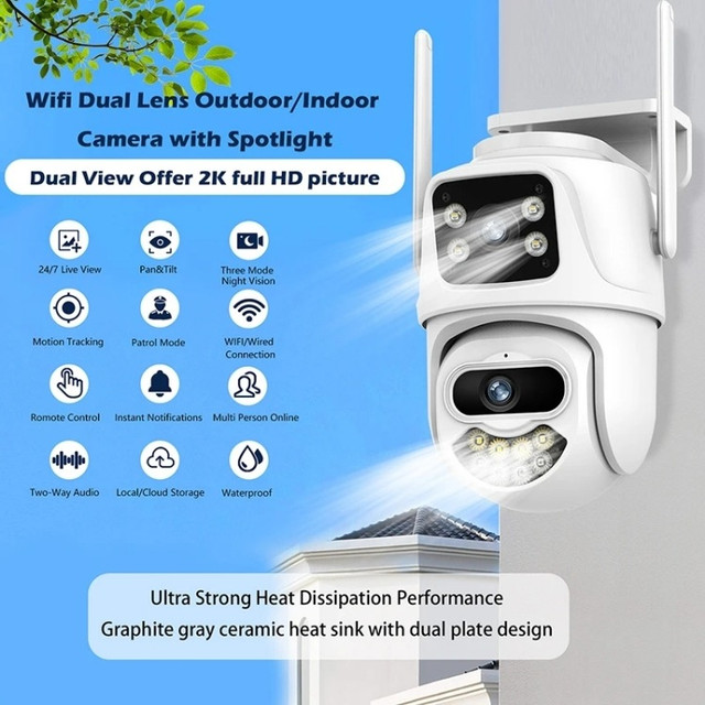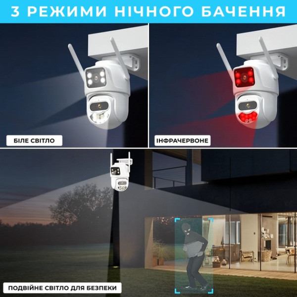 Функція розумного виявлення людини знижує кількість помилкових тривог, а нічне бачення до 25 метрів з ІЧ і LED-підсвіткою забезпечує яскраве та чітке зображення навіть у повній темряві. Висока якість запису досягається завдяки двом 4-мегапіксельним сенсорам, які формують деталізоване відео.