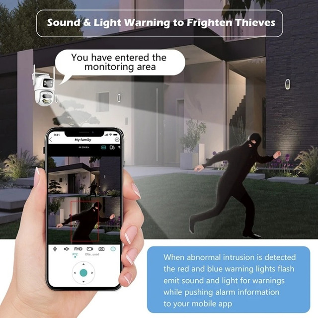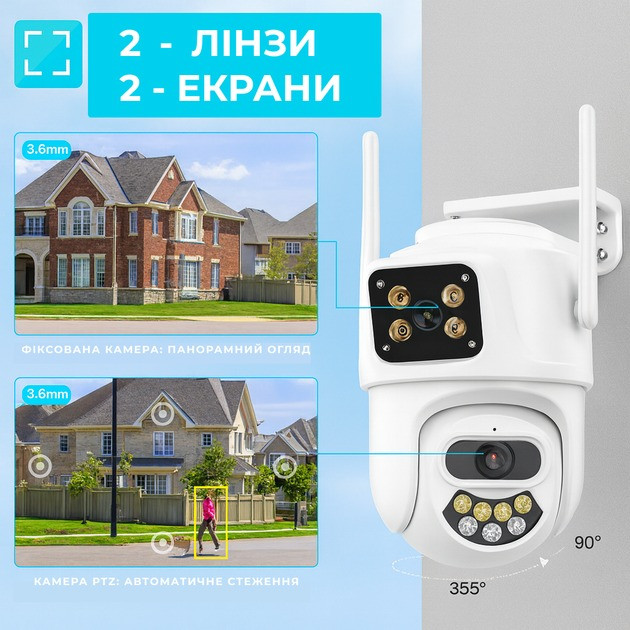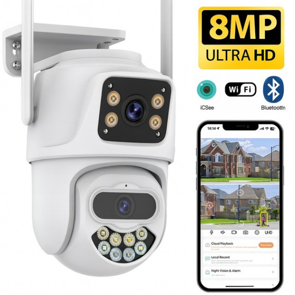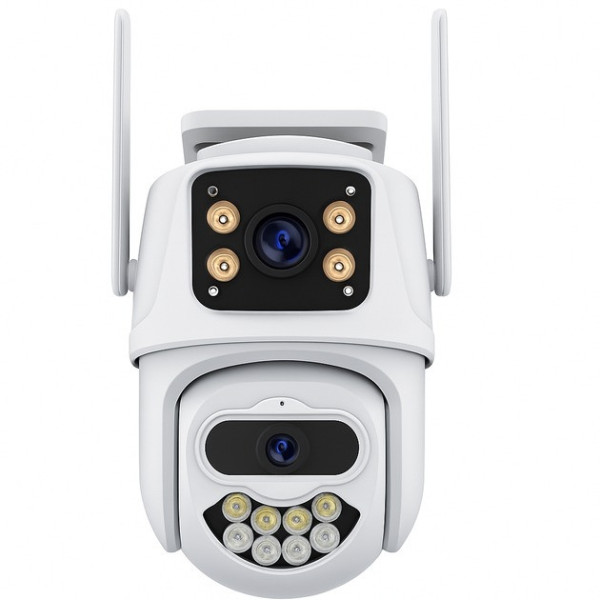 Вулична Wi-Fi IP-камера ICSEE 8MP PTZ — це сучасне рішення для надійної охорони будинку, офісу або бізнесу. Вона об'єднує в одному корпусі фіксовану камеру та поворотну PTZ-модель, забезпечуючи повний огляд території без сліпих зон. Верхній об'єктив фіксує обрану зону, а нижній автоматично повертається за рухомим об'єктом, гарантуючи максимальний контроль.