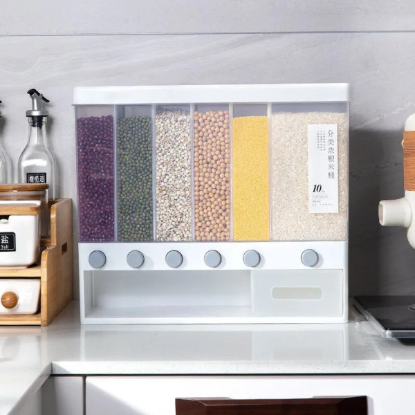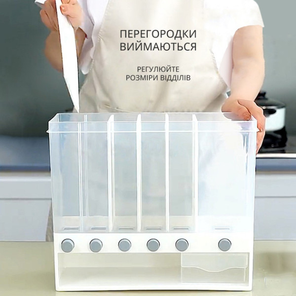 Диспенсер для круп і сипких продуктів Multiple Dispenser із 6 відсіками — це зручний і практичний органайзер для кухні, який допоможе підтримувати лад і зберігати свіжість продуктів. Контейнер призначений для зберігання різних типів круп, макаронів, бобових, горіхів та інших сипких інгредієнтів.