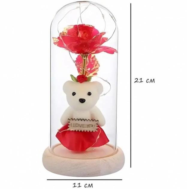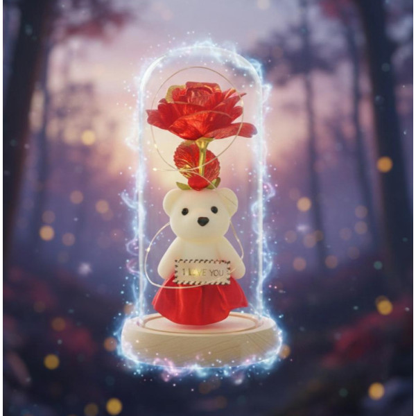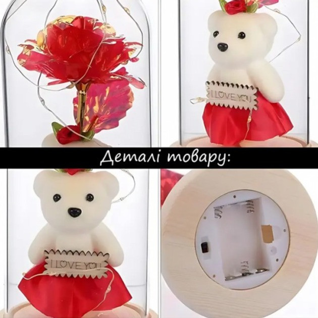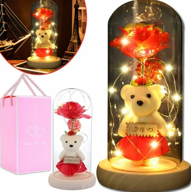 Кришталева троянда в колбі з ведмедиком і сердечком I Love You/Подарунковий сувенір із трояндою "I Love You" світильник нічник