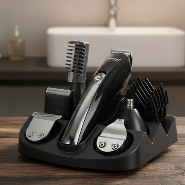Набір для стриження волосся Kemei, являє собою універсальну машинку для стриження з 11 насадками. Дві насадки для стриження ширини, насадки регулювання довжини 3-12 мм, тример для носа, дизайнерський тример, вузький тример, сіткова бритва, насадка 3-4,5 мм. Леза з неіржавкої сталі, вбудований акумулятор і індикатор заряду. Чудовий набір на всі випадки життя, замість кількох приладів Вам досить мати один такий.