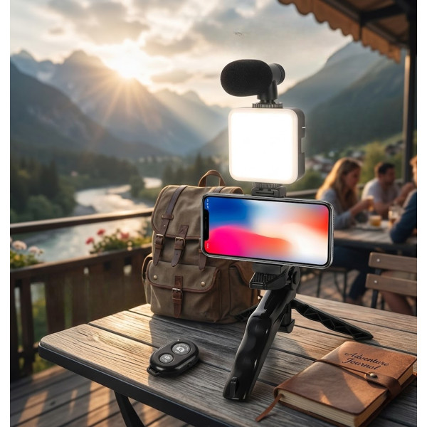 До набору входить: мікрофон, підсвітка, трипод, тримач для телефона та Bluetooth кнопка.