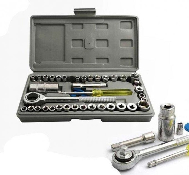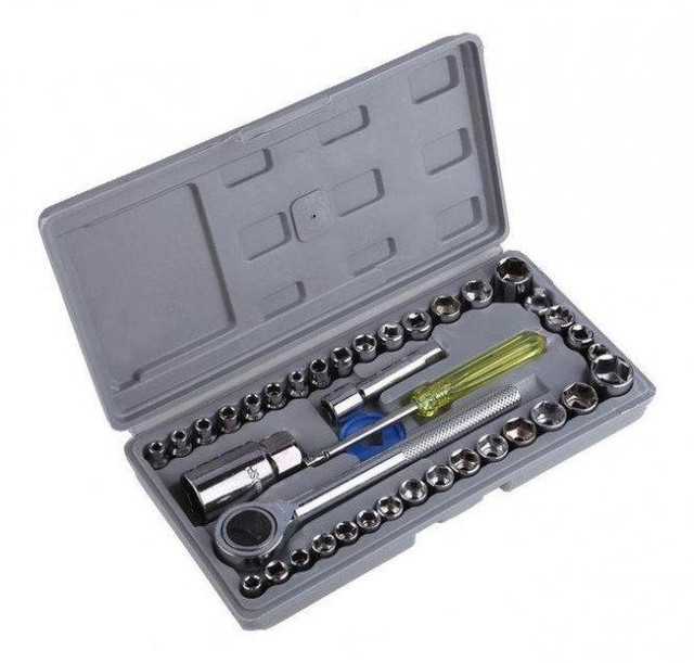 Набір інструментів головки Supretto з викруткою і тріскачкою 40 шт Набір інструментів 40 в 1 — це універсальний набір інструментів, який розроблений спеціально для проведення різних ремонтних робіт автомобіля. До нього входять головки, тріскачки та насадки, що дають змогу проводити операції навіть у важкодоступних місцях. Приємним доповненням є паковання — пластиковий кейс, у якому кожен предмет розташований на своєму місці. Набір інструментів у валізі забезпечує надійну збережність кожного приладу, його легко транспортувати. Портативний і переносний Набір має легку вагу та компактні розміри.