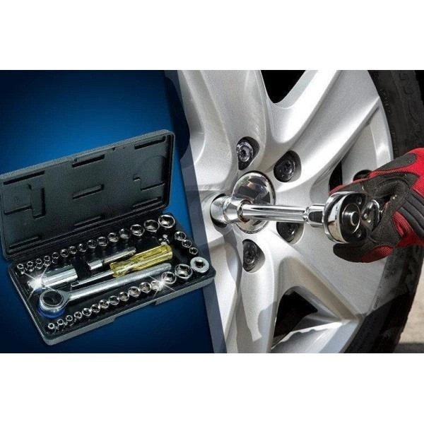 Характеристики: Матеріал: вуглецева сталь; Параметри (Д/Ш/В): 12x24x3.5 см; 40 деталей у наборі; Призначення: для ремонту автомобілів, велосипедів, мотоциклів; Вага: 1.04 кг; Паковання: пластиковий кейс. Комплектация: - Трещотка 3/8"; - Обертова ручка 1/4"; - Адаптер-перехідник 1/4x3/8" Подовжувач 3/8"; - Торцеві головки 1/4" метричні: 4, 4.5, 5, 5.5, 6, 6.5, 7, 7.5, 8, 9, 10, 11, 12, 13 мм; - Торцевие головки 1/4" разием Drive SAE: 5/32, 3/16, 7/32, 1/4, 9/32, 5/16, 11/32, 3/8, 13/32, 7/16, 15/32, 1/2, 17/32, 9/16"; - Торцеві головки 1/4" роз'єм Drive SAE 8PT: 1/4, 5/16, 3/8"; - Торцеві головки 3/8" метричні: 15, 16, 21 мм; - кольорова втулка; - пластиковий футляр.