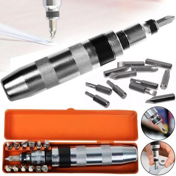 Набір ударних викруток Impact Lot AND містить 14 елементів і призначений для роботи з прикипілими та заіржавими гвинтами. Комплект підійде як для професійних майстрів, так і для використання вдома. Усі деталі виготовлені з міцної хромо-ванадієвої сталі (Cr-V), стійкої до механічних навантажень і зношування. Ударно-поворотний механізм із реверсом дає змогу ефективно справлятися зі складними кріпленнями, а ергономічна ручка з накаткою забезпечує надійне захоплення й контроль.