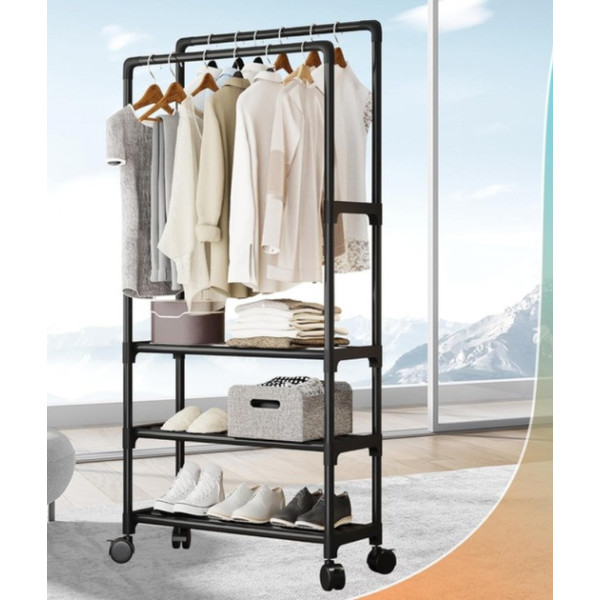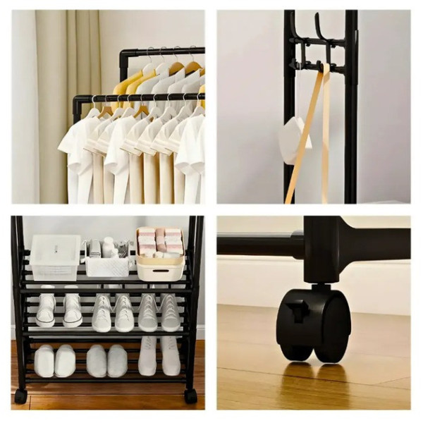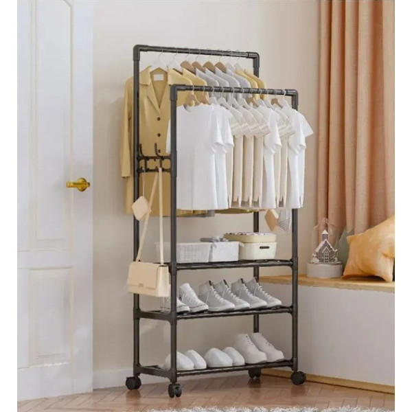Стійка виготовлена з міцного поліпропіленового пластику, труби з лаковим покриттям діаметром 16 мм і 12 мм, а також елементів із нетканого матеріалу, що гарантує довговічність і надійність конструкції. Додаткова полиця для взуття дає змогу зберігати взуття акуратно, економлячи місце в кімнаті.