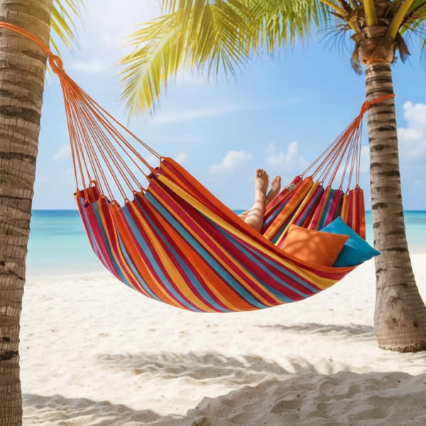 Завдяки високоміцній бавовні та надійним підвісним канатам, гамак витримує навантаження до 120 кг, рівномірно розподіляючи вагу. Одномісний дизайн забезпечує затишне місце для відпочинку, а яскраве забарвлення додає естетики в інтер'єр саду, балкона або тераси.