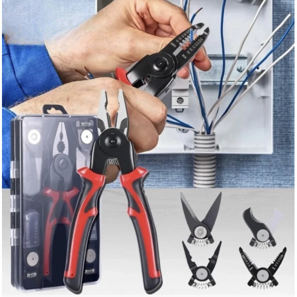 Набір змінних плоскогубців 5 в 1 — універсальний багатофункціональний інструмент для професіоналів і домашніх майстрів. До комплекту входять гострогубці для різання дроту, плоскогубці різних форм і розмірів, а також спеціалізовані насадки для роботи з кабелем. Виготовлені з високоякісної інструментальної сталі, інструменти забезпечують довговічність і надійність навіть за інтенсивної експлуатації.