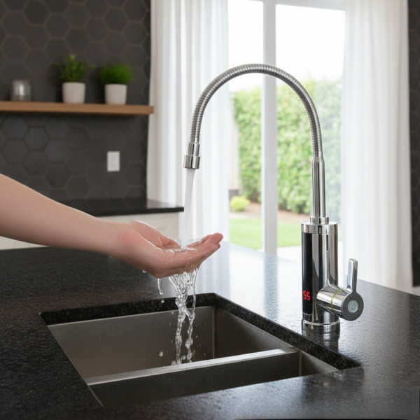 - Нагріває воду до 60 °C; (Швидкість нагрівання води залежить від початкового напору та первинної температури води); Виглядає набагато привабливіше від звичайного крана на кухні або у ванній;