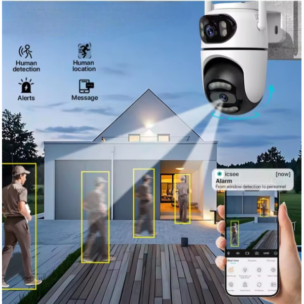 Вулична Wi-Fi камера відеоспостереження Q2 Dual Lens 360° — це сучасне рішення для цілодобової охорони будинку, дачі, складу або офісу. Обладнана подвійним об'єктивом і поворотним механізмом PTZ, камера забезпечує панорамний огляд 360° і контроль території без «мертвих зон».
