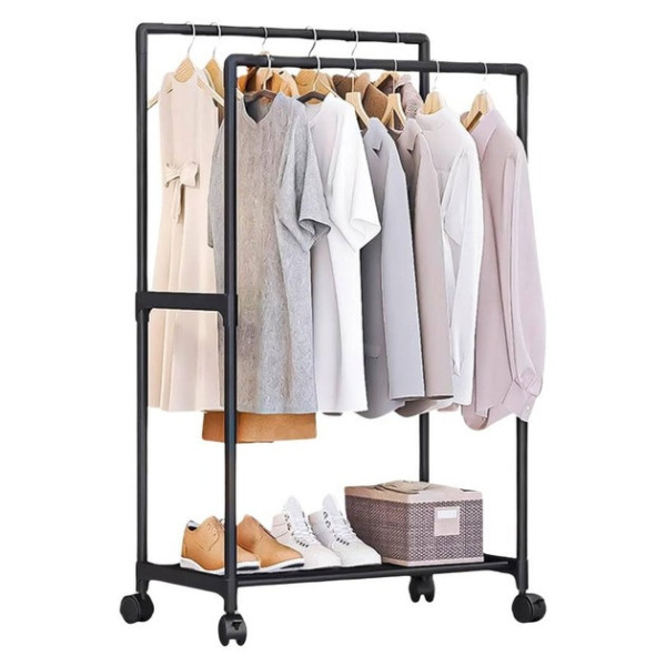 Вішак обладнаний коліщатками, що робить його мобільним і зручним під час перестановки або прибирання. Телескопічна конструкція дає змогу за потреби регулювати висоту штанг, а чорний метал у поєднанні з пластиковими елементами забезпечує міцність і стиль.