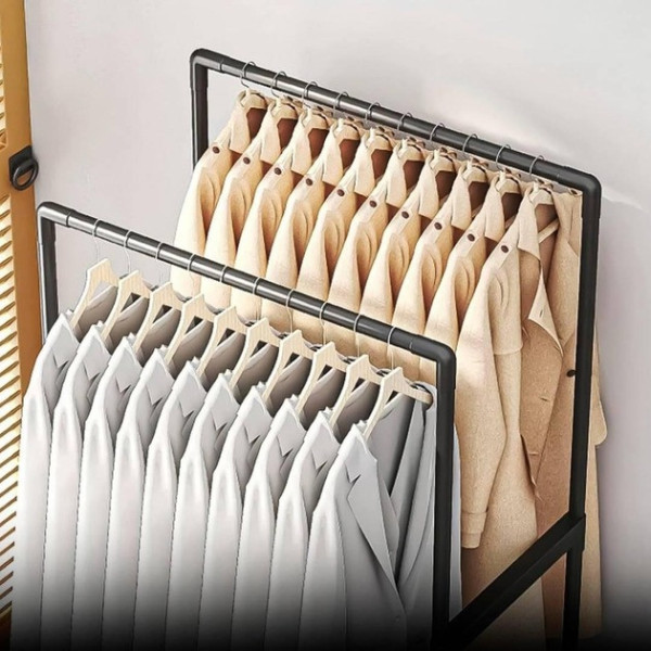 Пересувна підлогова вішалка Bodasan 9108 — практичне рішення для зберігання одягу вдома, у гардеробній або магазині. Подвійна конструкція з двома штангами дає змогу розвішувати більше речей, а полиця під штангами забезпечує додаткове місце для взуття, аксесуарів або сумок.