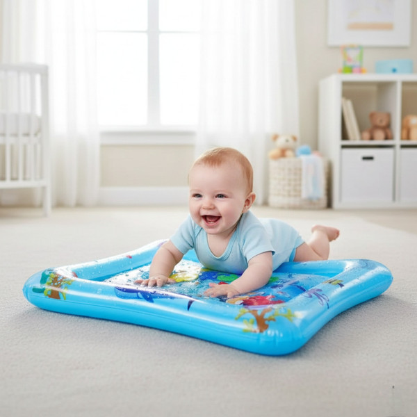 Килимок яскравий, цікавий і постійно гойдається. Також у ньому плавають різні фігурки кольорових рибок. Просто потрібно заповнити його водою, поставити на рівну поверхню та покласти немовляти животиком униз.