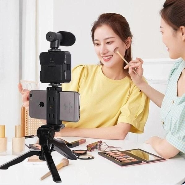 До набору входить: мікрофон, підсвітка, трипод, тримач для телефона та Bluetooth кнопка.