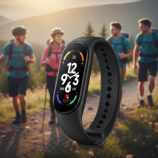 Band M7 — стильний і компактний фітнес-трекер. Браслет може вважати кроки, калорії та відстань, оцінювати якість і кількість сну, вимірювати частоту пульсу та навіть визначити артеріальний тиск. Також підтримуються повідомлення про дзвінки та повідомлення зі смартфона та керування його камерою, пробудження екрана підняттям зап'ястя та ін. функції. Фітнес-браслет обладнаний 0,96-дюймовим, кольоровим TFT-дисплеєм 128 x 80 пікселів.