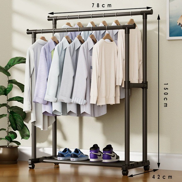 Подвійна підлогова пересувна стійка для одягу Double Pole 3 JL-DSG-8641 Дає змогу зручно та компактно зберігати речі в розвішеному стані в будь-якому місці вашої квартири, не займає багато місця, витримує велику вагу. Вішалка Double Pole (30 кг) підлогова для одягу подвійна телескопічна Зручна та досить велика стійка для одягу Double Pole Clother Hose. Оскільки стійка для одягу Double Pole Clother Hose повністю збірна, і до того ж без єдиного болта, гвинта або шурупа, зібрати та розібрати її, за потреби, не становитиме великих труднощів і часу, в середньому на збирання піде не більш ніж 20-30 хвилин (якщо не поспішати). Всі трубки стійки скріплюються за допомогою великих пластикових затискних замків.