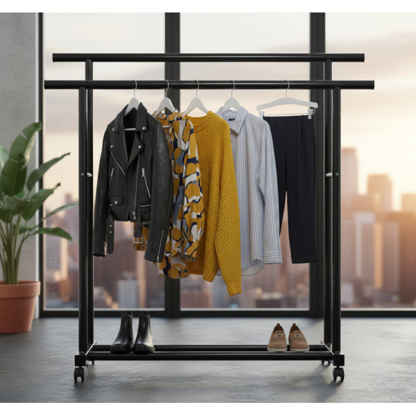 Трубки стійки Double Pole Clother Hose виготовлені з алюмінію і покриті захисною фарбою оливкового кольору, порожнисті всередині, тому стійка навіть у складанні буде вабити не більш ніж 1,5 кг. Пластикові заглушки на кінцях труб, зібраної конструкції, захистять одяг і запобігають випадковому падінню одягу, якщо він буде просто накинута на стійку. Великим плюсом стійки для одягу Double Pole Clother Hose є наявність невеликих коліщаток, завдяки яким Ви зможете пересунути стійку навіть повністю завіщеним одягом. Стійка Double Pole Clother Hose виготовлена як двоповерховий, для впорядкування та нормального, компактного розміщення одягу на ній. Бічні поперечні планки зручні для розміщення на них, допустимо, випрасованих штанів. Найкраще для стійки використовувати вішалки, так одягу можна розмістити в рази більше.