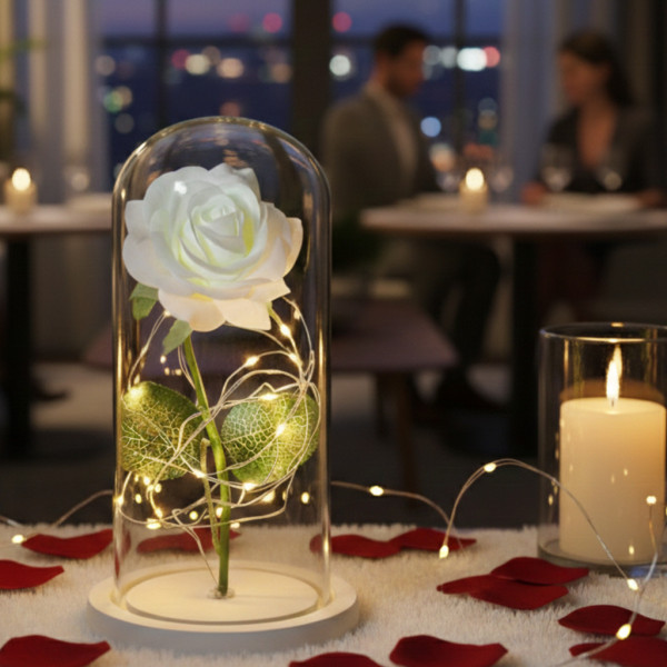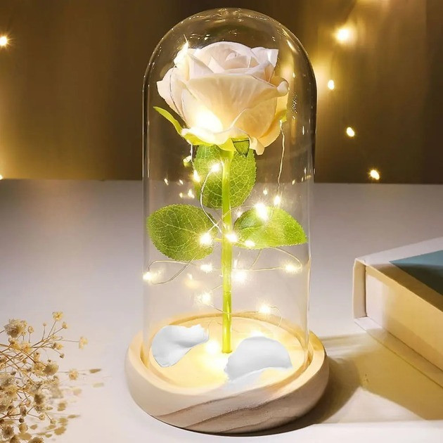 Світлодіодний нічник «Роза в скляній колбі» поєднує естетичний дизайн і функціональність, створюючи затишну та романтичну атмосферу в будь-якому приміщенні. Штучна біла троянда всередині прозорої скляної колби м'яко підсвічується LED-лампою, випромінюючи комфортне світло, що підходить для спальні, дитячої, вітальні або робочого куточка.