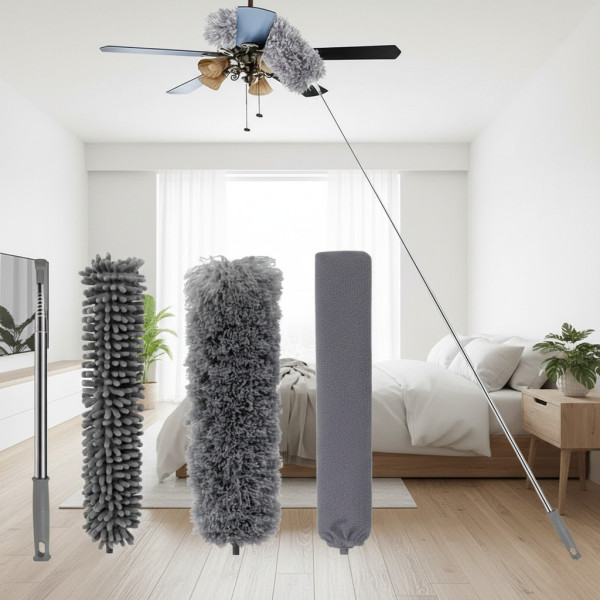 Телескопічна щітка для прибирання з трьома змінними насадками — це зручний і універсальний інструмент для наведення чистоти у важкодоступних місцях. Завдяки висувній ручці завдовжки до 280 см і трьом різним насадкам, ви зможете легко очистити стелі, вентиляційні решітки, жалюзі, люстри, полиці та інші високі поверхні без використання драбини.