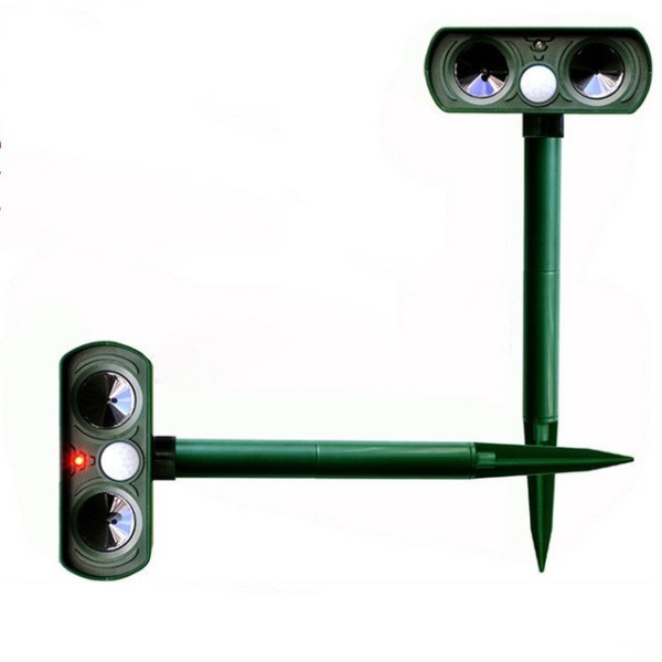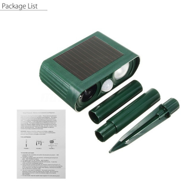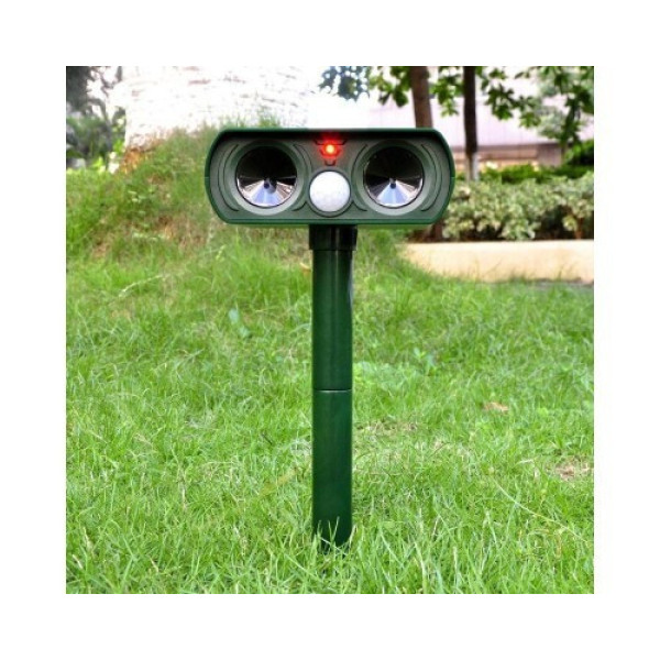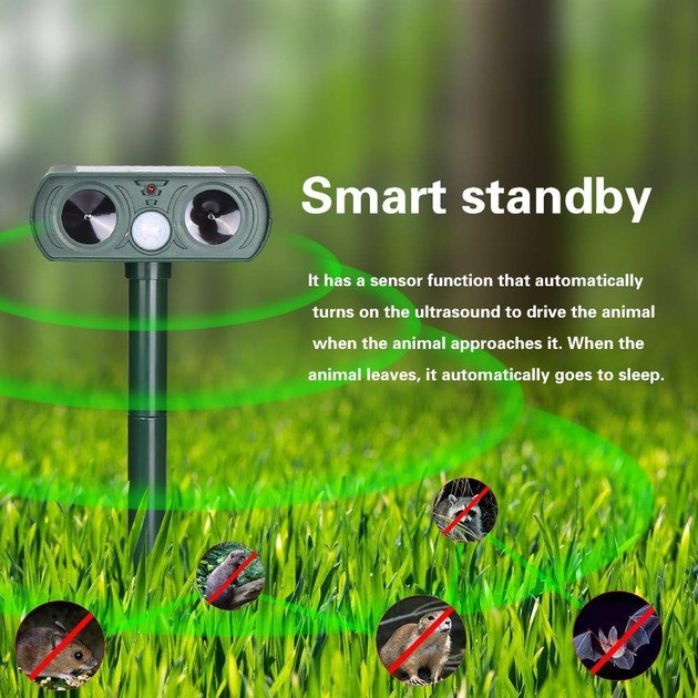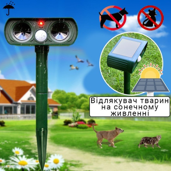 Solar Animal Repeller — компактний ультразвуковий відлякувач для захисту ділянки від собак, кішок, птахів і дрібних тварин. Прилад безпечно відлякує тварин за допомогою ультразвуку та вбудованих миготливих білих світлодіодів, створюючи зону, до якої тварини не заходять.