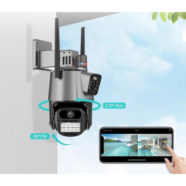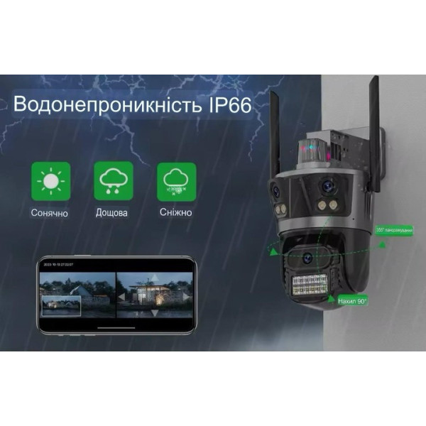 Вулична Wi-Fi IP-камера Icsee XM77 — це інноваційне рішення для цілодобового відеоспостереження та захисту вашої території. Завдяки трьом незалежним об'єктивам сумарною роздільною здатністю 12 МП камера забезпечує надширокий кут огляду до 270°, створюючи деталізоване зображення без «сліпих зон».
