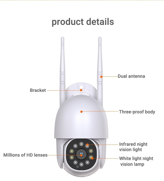 Камера обладнана функцією нічного бачення з ІЧ і LED-підсвіткою, що дає змогу отримувати чітке зображення навіть у повній темряві. Вбудовані мікрофон і динамік забезпечують двобічний аудіозв'язок, а інтелектуальний датчик руху автоматично починає запис у разі виявлення активності.