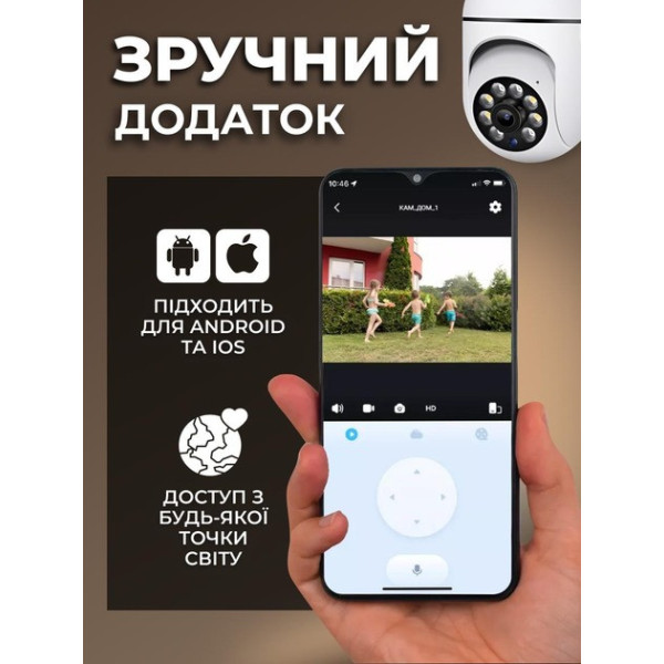 Вулична Wi-Fi PTZ IP-камера A1 2 Мп — це надійне рішення для цілодобового відеоспостереження за будинком, двором, дачам або гаражем. Завдяки поворотній конструкції та віддаленому керуванню через застосунок V380Pro, камера замінює відразу кілька звичайних камер і забезпечує повний контроль за територією.