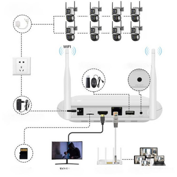 Бездротовий Wi-Fi відеореєстратор на 8 IP-камер — сучасне та зручне рішення для організації системи відеоспостереження будинку, офісу, квартири або дачі. Пристрій дає змогу під'єднати до 8 бездротових IP-камер і забезпечує стабільний запис, віддалений перегляд і керування через мобільні програми ICSee і XMeye.